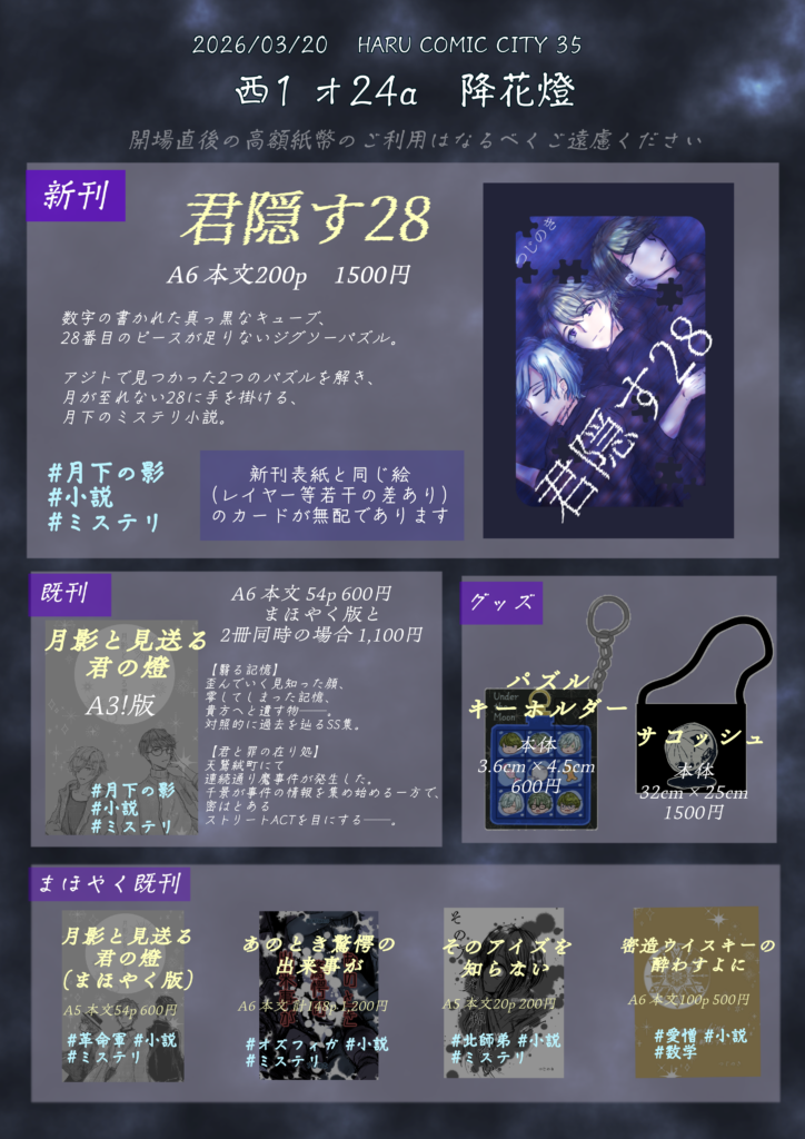 【3/19追記】データ不備によりタイトルが見えないというタイトル回収をしました。が、本体表紙の素材上カバーなしの頒布はするべきでないため、金額を下げての頒布、また今後のイベントでの交換対応をします。実物現地でご確認いただきご検討ください。